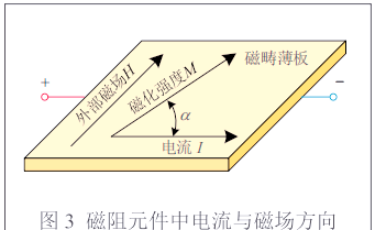 当外部磁场与磁阻元件中的电流夹角α发生变动时,磁阻元件的电阻R也会随之改变,具体关系如下