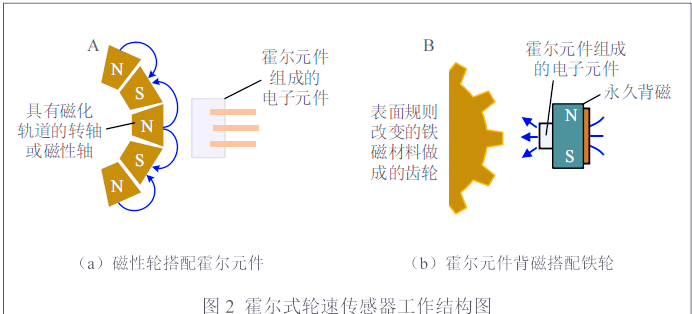 式中,I代表输入电流,B代表磁感应强度,n代表自由电子浓度,e代表电子电荷量,d代表霍尔元件厚度,KH代表霍尔系数,它定义了霍尔元件的灵敏度,且仅与元件材料相关,是一个常量。根据公式,当UH、I和B中的两个参数确定时,第三个参数也随之确定。需要特别留意的是,自由电子浓度n对温度变化非常敏感,因此必须采取措施消除温度变化所带来的影响。霍尔式轮速传感器的工作原理结构如图2所示。